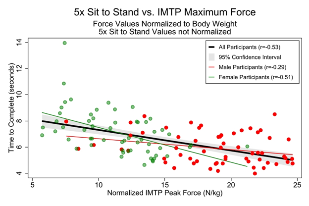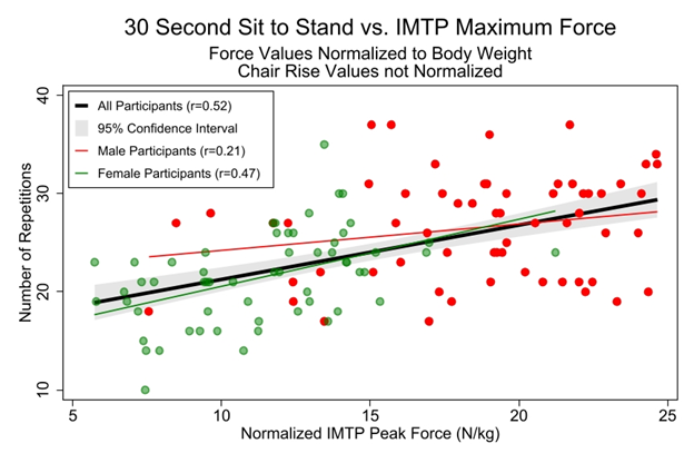 There was a poorer correlation between 5xSTS (r = -0.53) and CRT30 (r = 0.52), which is poorer than in previous studies using CRT30 (r = 0.67) [15,16]. It is unclear whether sit-to-stand tests reflect muscle strength or physical performance (functional capability) [33]. The biomechanical and neuromotor demands of sit-to-stand tests are similar to the IMTP. However, in sit-to-stand tests the cumulative effect of momentum and fatigue with sequential repetitions adds variability to the test and may explain the more modest correlations to the IMTP. Lastly, the IMTP is conducive for full intention and neural processing for a maximum effort which is different from the repetition goals of the chair tests.