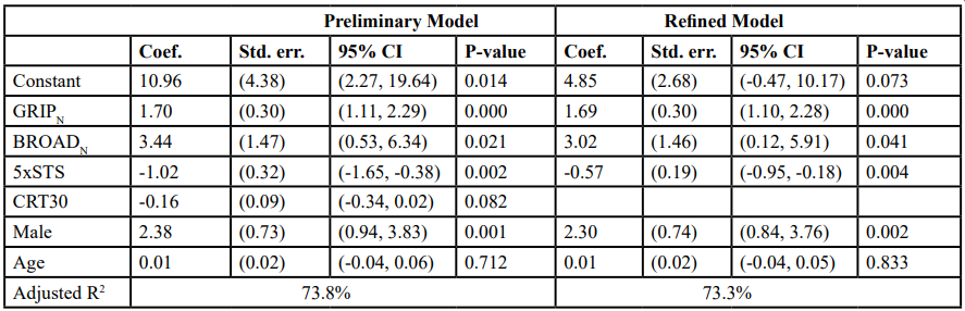 Because GRIPN, BROADN, 5xSTS, and CRT30 each reflect one portion of the IMTP, we hypothesized that each would contribute to synergistic performance on the IMTP. Therefore, we attempted to predict IMTPN via multiple linear regression with age, GRIPN, BROADN, 5xSTS, and CRT30 as continuous covariates with gender as a categorical covariate. We evaluated the regression models thoroughly to determine the most parsimonious model and to determine the effects of influential cases [25-27].
