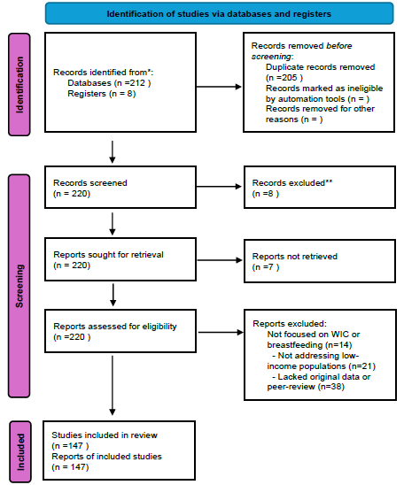 The initial search yielded 212 articles. After title and abstract screening, 147 articles were reviewed in full text. Of these, 28 studies met the inclusion criteria and were selected for final analysis. These studies varied in design, including randomized controlled trials, observational studies, and qualitative case studies, offering a comprehensive view of current breastfeeding interventions in WIC-eligible populations.