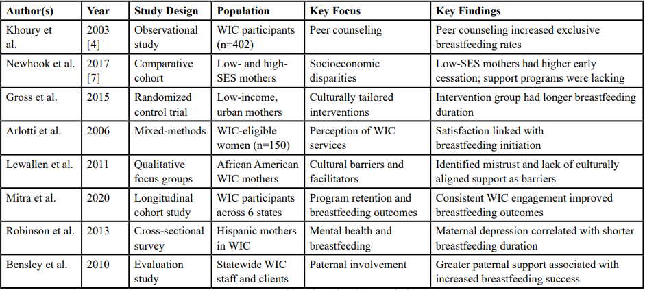 To address the existing gaps and underexplored areas—or "silences” in the literature concerning breastfeeding rates among low-income and WIC-enrolled populations, a systematic literature review was conducted. The term "silences" refers to aspects of the topic that are infrequently discussed or insufficiently researched in scholarly work, such as the roles of paternal involvement, culturally specific support models, and the intersection of mental health with breastfeeding outcomes. This review focused on identifying evidence-based breastfeeding interventions that consider these dimensions and evaluated their effectiveness in improving maternal and infant health outcomes within economically disadvantaged communities.