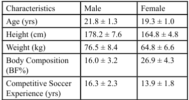 Fifteen male and fifteen female NCAA Division II soccer players completed the IRB approved testing protocol with no adverse events recorded. All participants reported as being right leg dominant, therefore no differentiation between dominant and non-dominant limb was required for reporting purposes. Descriptive characteristics of male participants (n = 15) and female (n = 15) are noted in Table 1.