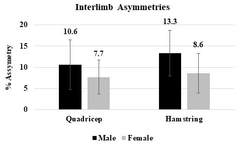 Values used in the comparative analysis for asymmetry of the quadricep and hamstring muscles were derived from the equation: asymmetry = (stronger limb -weaker limb) / stronger limb * 100 [25]. While not statistically different (p = 0.34), interlimb asymmetries for the quadriceps muscle group were elevated in the male participants. Male participants possessed an average quadricep interlimb asymmetry magnitude of 10.62% ± 5.99 compared to 7.70% ± 4.63 for female participants.