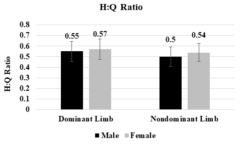 H:Q ratio asymmetry was calculated by dividing peak torque achieved by the hamstrings by peak torque achieved by the quadriceps. While females showed elevated H:Q ratios for both limbs as compared to males, no significant differences were observed in H:Q ratio between the sexes in the dominant (p = 0.485) or nondominant legs (p = 0.195). Values for H:Q ratios between sexes for can be found in Figure 2.