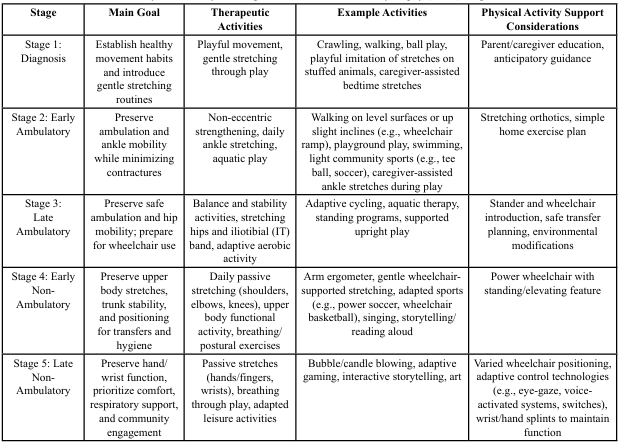 These stages are intended to guide safe participation in physical activity throughout the progression of DMD function. Each stage builds on the previous one unless specific weaknesses prevent an activity. While every stage has its own focus, no priority from an earlier stage should be abandoned. Daily lower and upper extremity stretching to prevent contractures, avoidance of eccentric loading, and careful fatigue management always remain essential. Activity selection should progress with the individual, but the underlying principles of preserving function, dignity, comfort, and enjoyment should remain constant. Importantly, engagement in meaningful, community-based participation should persist from diagnosis through late-stage care.