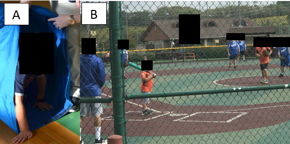 Figure 1. Stage 1 DMD boy (A) crawling through soft tunnel and (B) playing baseball in a community-based adapted sports league.