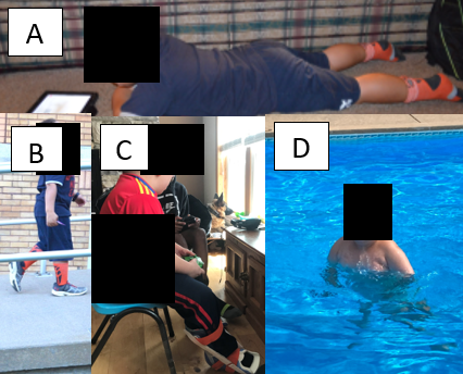 Figure 2. Stage 2 DMD boy (A) reading aloud as a breathing exercise while lying prone to stretch hip flexors, (B) walking up wheelchair ramp, (C) playing a video game while stretching calves with a stretching nighttime splint, and (D) moving in a pool.