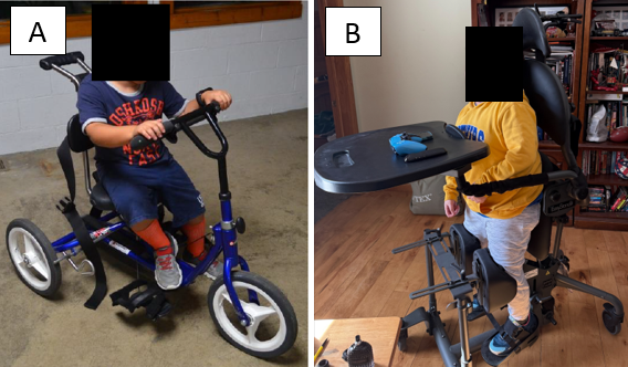 Practical examples (Figure 3) include adaptive bikes to enable safe lower body movements without excessive stress, or water-based walking and floating exercises to reduce joint loading. Wheelchair use may be introduced to reduce fall risk, conserve energy, and prevent excessive fatigue. Supported standing devices should also be considered, even while limited ambulation is still possible, as they promote bone health, posture, digestion, and respiratory function [3]. Introducing a stander before full-time wheelchair use helps maintain upright positioning as part of daily routines. Above all, activities should emphasize enjoyment over achievement, allowing people with DMD to feel empowered and safe. Promoting independence remains a central goal.