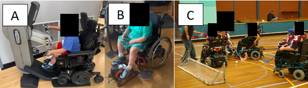 Figure 4. Stage 4 DMD boy (A) using arm ergometer and (B) electric elliptical trainer in wheelchair, and (C) competing in wheelchair hockey.