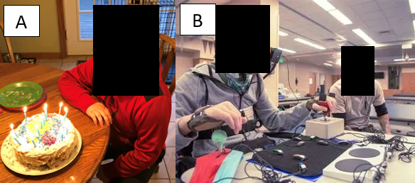 Figure 5. Stage 5 DMD boy (A) blowing out candles after helping to make the cake, and (B) using adaptive gaming kit to play video games.