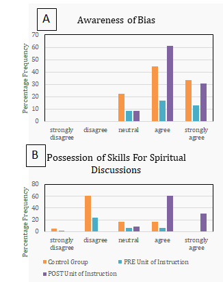 Seventy-seven percent of the no-unit group ELOT students and thirty percent of pre-unit ELOT students reported agreement with the statement “I am aware of my personal biases related to spirituality.” After the unit of instruction, ninety-two post-unit ELOT students report agreement with the statement. Seventeen percent of the no-unit group ELOT students and six percent of pre-unit students reported agreement with the statement “I possess the skills needed to have difficult spirituality discussions.” After the unit of instruction, ninety-two percent post-unit ELOT students report agreement with the statement.