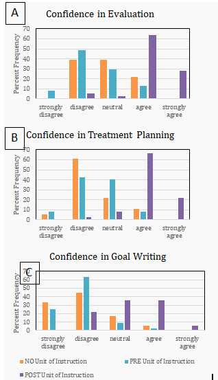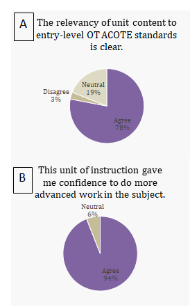 Seventy-eight percent of post-unit ELOT students report agreement with the statement, “the relevancy of unit content to entry-level OT ACOTE standards is clear.” Three percent disagreed with the statement. Ninety-four percent of the post-unit ELOT students agree with the statement “this unit of instruction gave me confidence to do more advanced work in the subject.”
