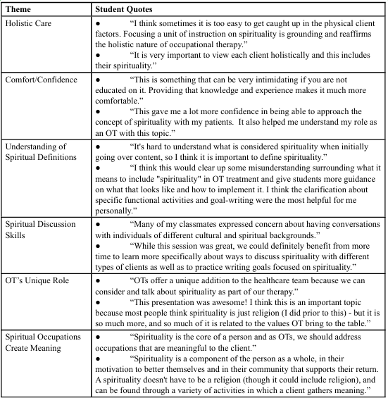 Post-unit ELOT student survey participants answered the question “should a spirituality unit of instruction be added to entry-level OT curriculum?” Six thematic reasons to include a spirituality unit of instruction include to prepare students for holistic care as therapists, increase comfort/confidence with addressing patient spiritual needs, increase understanding of spiritual definitions, develop discussion skills, underline a unique role of OT and emphasize how spiritual occupations create meaning.