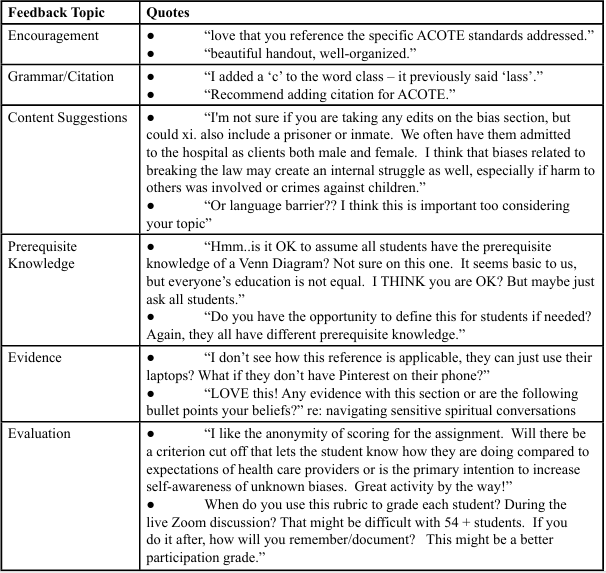 To determine common themes within the student and the instructor qualitative feedback, answers were copied into Microsoft Word. Repeated words were highlighted in matching colors to determine themes. The themes were then listed with quotes in each category.