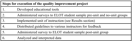 The first aim of this quality improvement project was to develop an evidence-based online spirituality unit of instruction to increase confidence, self-awareness, and knowledge of ELOT students. The second aim was to evaluate the effectiveness of the unit of instruction using quantitative and qualitative pre/post outcome measures. The third aim was to develop faculty approved guidelines for the incorporation of a spirituality unit of instruction into ELOT curriculum.