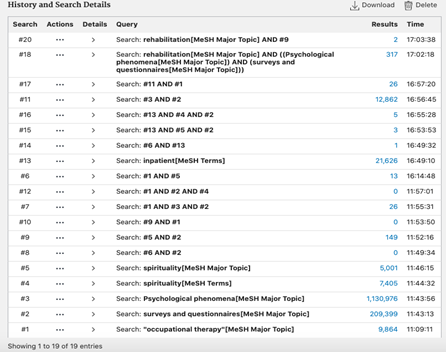 Five searches of MeSH terms like the one in Figure 2 were conducted over the course of two weeks. The resulting articles from the MeSH term searches were read, summarized, and written in a Word document using thematic topics of definitions, theoretical basis, relationships between spirituality and OT, barriers to addressing spirituality, potential solutions, appropriate OT spirituality assessments, interventions, and ideas for future study.