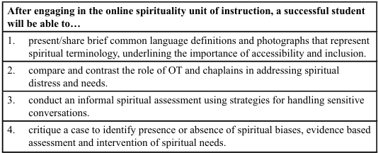 Practicing occupational therapists also report an educational barrier to the inclusion of spirituality in practice [6-8]. Clinicians report that their ELOT education did not train them to evaluate and treat spiritual needs of patients [6-8]. Likewise, ELOT students report low confidence in the ELOT curriculum to prepare them for addressing spirituality needs [9,10]. A spirituality unit of instruction in an ELOT course may serve as a solution to the educational barriers of needed conversational skills, unfamiliarity of OT’s spiritual role, and common spiritual language. Therefore, the premise of this project was that students would benefit from participation and engagement in a spirituality unit of instruction to ultimately enhance patient recovery outcomes in the future and essentially lessen the educational barrier of addressing spirituality in practice.