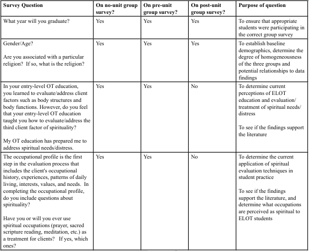 Two hospital chaplains, from a hospital neighboring the university, were included in the development of the unit-of-instruction content who were agreeable to openly discussing their role of addressing spiritual needs of patients and their perspective of OT’s role.