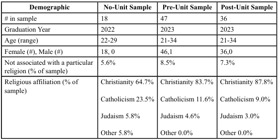 Fifty class of 2023 ELOT students participated in the three-hour unit of instruction. Forty-seven class of 2023 (pre-unit) ELOT students completed the pre-unit of instruction survey. Thirty-six class of 2023 (post-unit) ELOT students completed the post-unit of instruction survey. Eighteen class of 2022 (no-unit group) ELOT students did not participate in the unit of instruction but completed the no-unit group survey. The no-unit group survey and post-unit survey were completed by all females and only one male completed the pre-unit survey. Six percent of the class of 2022 ELOT students and seven to eight percent of the class of 2023 ELOT students report no affiliation with a particular religion. Most of the class of 2022 ELOT students (64%) and class of 2023 ELOT students (83-87%) are associated with the Christian religion. Six percent or less of class of 2022 and 2023 ELOT students are associated with Judaism.