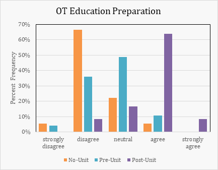 Six percent of the no-unit group and eleven of pre-unit ELOT students report agreement with the statement “My OT education has prepared me to address spiritual needs/distress.” After participating in the unit of instruction, seventy-two percent of the post-unit ELOT students report agreement with the aforementioned statement.