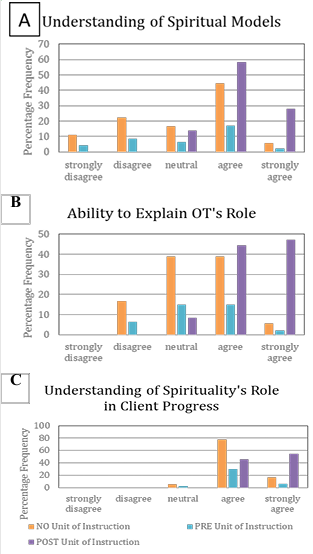 To determine changes and/or difference between group responses to Likert scale questions, data were downloaded from Redcap into a Microsoft Excel workbook. Each Likert scale question was listed with pre-unit, post-unit, and no-unit answers to create a data array. Then the bins array was created in a table using numbers 5, 4, 3, 2, 1 correlating to strongly agree, agree, neutral, disagree, strongly agree respectively. Lastly, using the Excel Frequency Array Formula, frequency of answers was determined and divided by number in the sample times one hundred for the percentage. Percentages allowed for comparisons to be made between groups. Data from the frequency percentage tables were represented via bar graphs in Excel. To meet the aims and hypothesizes of this project, data were compared (1) between pre-unit and post-unit for increases and (2) between pre unit and no-unit for biases and (3) between post-unit and no-unit for unit effectiveness at address the educational barrier to inclusion of spirituality in OT practice.
