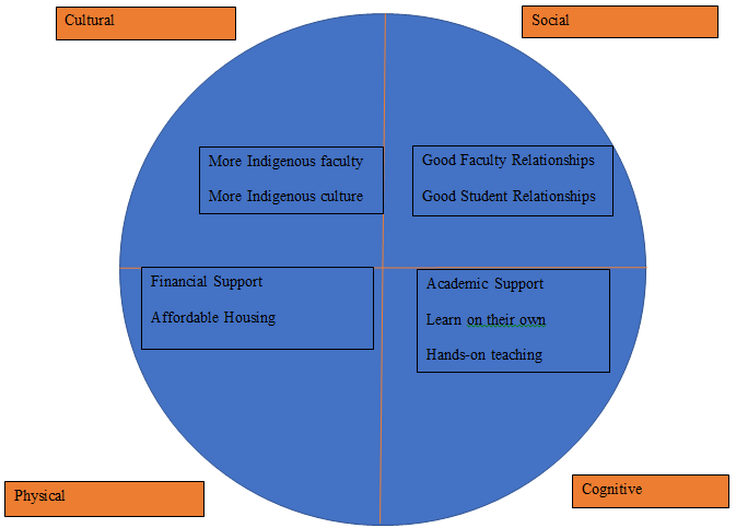 From previous research and from longstanding Indigenous ways of life (citing Elder Mike Arnouse, Secwepemc), wellness and success for Indigenous students can be said to consist of four components in a circle [9] (refer to Figure 1): social, cognitive, physical, and cultural. The social component consists of good relationships with faculty and students. The cognitive component consists of academic support, hands-on learning, and learning on one’s own. The physical component comprises financial support and affordable housing, especially important for students who are single parents. And the cultural component includes having more Indigenous cultural events and more Indigenous faculty at university. We can see from the data and recommendations noted below from our pool of studies that these four circle components contribute to Indigenous student success in higher education.