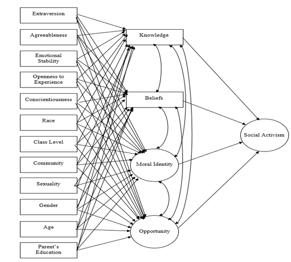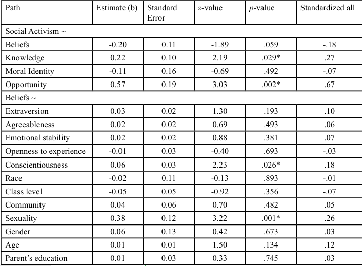 Parameter estimates were utilized to assess the paths in the model. According to the parameter estimates, a few of the paths were statistically significant (Table 3). Consistent with our hypothesis, the latent variable of Opportunity (p = .001) and the Knowledge manifest variable (p = .029) significantly predicted Social Activism. The latent variable of Moral Identity and the manifest variable of Beliefs did not significantly predict Social Activism. Personality factors and social structure showed a few significant indirect paths as well.