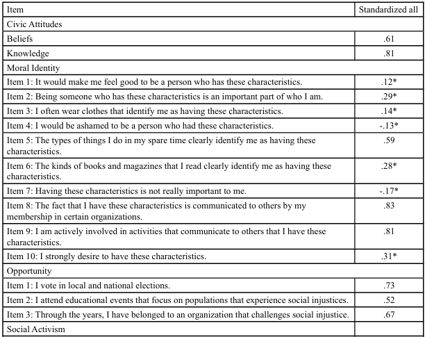 Prior to assessing the full structural equation model (SEM), the four latent variables were assessed: Civic Attitudes, Moral Identity, Opportunity, and Social Activism. The factor loadings for each manifest variable, within the constructs, were assessed to examine if the items were “good” items. The standard criteria for a loading is a value greater than 0.3 [55,56]. Using this criterion, seven items on the Moral Identity construct had poor loadings: item 1, item 2, item 3, item 4, item 6, item 7, and item 10. The seven items were removed from the model and the model was re-examined. Removing the bad items significantly improved the model (Δχ2 = 669.62, Δdf = 140, p < .001), however, model fit remained poor, χ2(129) = 343.50, p < .001, RMSEA = .10 [.85-.11], SRMR = .08, CFI = .84, NFI = .77, TLI = .81.