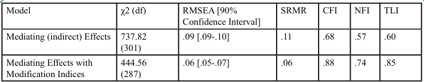 The next step assessed the modification indices of the mediating effects model (Figure 1). New paths were added to the model to improve the fit. The updated model included a correlation path between Beliefs and Knowledge, Beliefs and Moral Identity, Beliefs and Opportunity, Knowledge and Moral Identity, Knowledge and Opportunity, and Moral Identity and Opportunity. Adding the additional paths makes theoretical sense. The model produced a significant improvement in fit with the addition of the modification indices (Δχ2 = 293.26, Δdf = 14, p < .001). However, according to the fit indices of the final model, the goodness of fit indices appeared to be poor while the residual indices were excellent suggesting an improved, moderate model fit (Table 2).