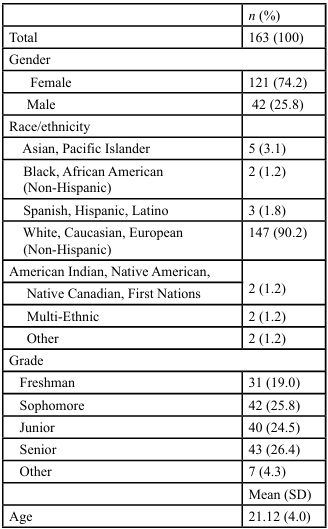 Table 1 shows the demographic characteristics of the sample. Out of 163 sampled, the vast majority of survey participants were women (74.2%) and white (90.2%). The students were distributed across grade levels, with the highest proportion in the senior year (26.4%), followed by the junior year (25.8%) and the freshman year (24.5%). Their mean age was approximately 21 years old.