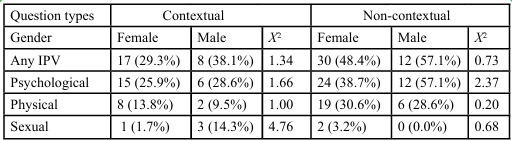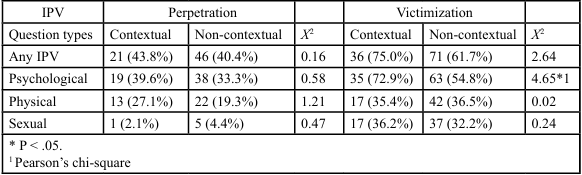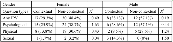 Table 4 describes the gender difference in reporting IPV perpetration depending on contextual or non-contextual questions. None of the gender differences in reporting both IPV perpetration and victimization based on contextual versus non-contextual questioning were statistically significant.