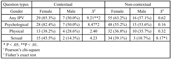 In both contextual and non-contextual groups, more female students than male students reported experiencing sexual violence from their intimate partners; but only the non-contextual group showed a statistically significant gender difference. Although no context qualifier was added to a sexual violence question, as with psychological violence, the respondents might have answered as if it was also contextualized. Sexual IPV victimization rates of women compared to men tend to be higher in most of the national studies that did not use contextual qualifiers [20,23]. Our findings might reflect this general prevalence of sexual IPV victimization, yet it may be due to the small sample size of the contextual group (only 17 students in total, with two male students).