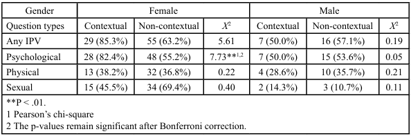 Table 5 illustrates the gender differences in reporting IPV victimization depending on contextual or non-contextual questions. In the sample of students who responded to contextual questions, there were significant gender differences in reporting any IPV victimization (X2(1) = 9.21, p = .007) and psychological violence victimization (X2(1) = 8.47, p = .04). Both results were no longer considered statistically significant after applying the Bonferroni correction with a significance threshold of p < .00625.