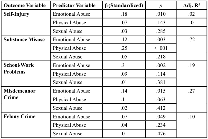 Table 1: Multiple Regression Predicting Adult Behavioral Outcomes from Childhood Abuse Subtypes (N = 201)