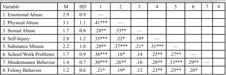 This study endeavors to differentiate emotional, physical, and sexual abuse as independent predictors, thereby facilitating a more nuanced understanding of how each type contributes to distinct patterns of behavioral risk. Specifically, the study aims to examine whether emotional, physical, and sexual abuse independently predicts five domains of adult behavioral functioning: self-injury, substance misuse, problems in academic or occupational settings, misdemeanor behavior, and felony behavior, utilizing empirically validated scales derived from a trauma outcomes dataset.
