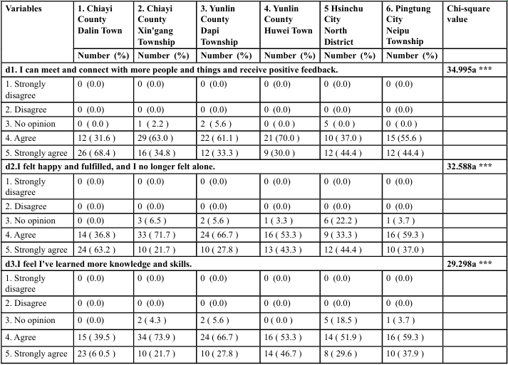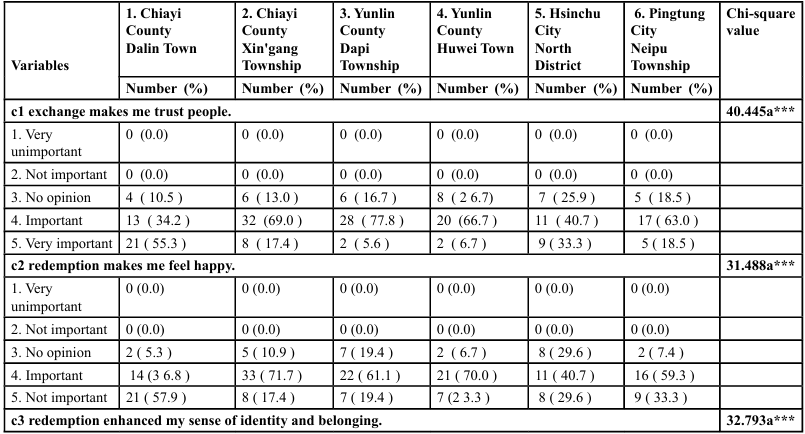Chi-square tests were conducted on key variables to examine whether perceived exchange benefits differed significantly across the six sites (Dalin, Xingang, Dapi, Huwei, Beigang in Hsinchu City, and Dongpian in Neipu).