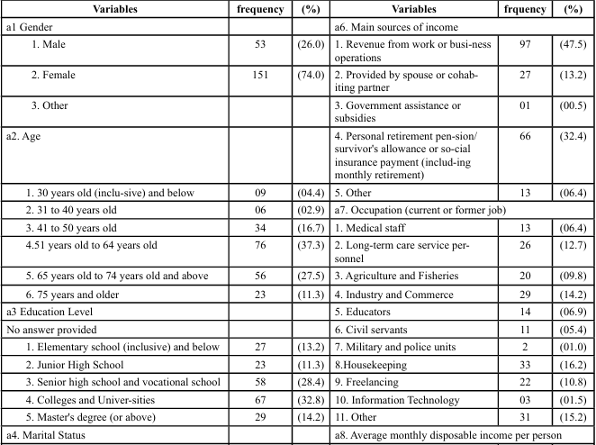 Regarding education, 32.8% (67) had a college degree, 28.4% (58) had completed senior high or vocational school, 14.2% (29) held a master's degree or higher, 13.2% (27) had elementary school education or below, and 11.3% (23) had junior high school education.