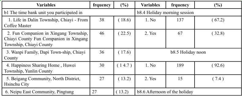 Of the 204 respondents, the largest share, 22.5% (46), were members of the "Smile Fun-ban" time bank in Xingang Township, Chiayi County. This was followed by "Living Hands Café" in Dalin Township, Chiayi (18.6%, 38), "Wanpi Family" in Dapi Township, Yunlin (17.6%, 36), "Happy Sharing Home" in Huwei Township, Yunlin (14.7%, 30), and Beigang Community in Hsinchu City and Dongpian Community in Neipu Township, Pingtung (both 13.2%, 27).