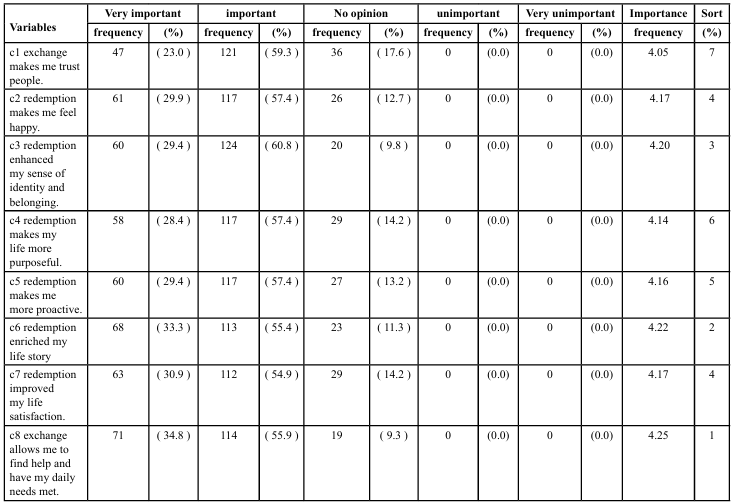 Overall, for all items, the combined proportion of "very important" and "important" exceeded 80%, and no participants rated any item as "unimportant" or "very unimportant." This indicates that time bank exchange activities are widely perceived as highly beneficial. Among the items, the "very important" responses were highest for "exchange activities allow me to seek help from others and have my life needs met" and "exchange activities enrich my life story" (34.8% and 33.3%, respectively), suggesting that participants particularly value the resolution of everyday needs and the enrichment of personal life narratives.