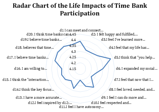 All items measuring life impact showed mean scores above 4, confirming that time bank participation positively affects everyday life. The highest means were for d1 and d5 (4.39 and 4.43), indicating that participants particularly value the opportunity to connect with more people and things and to cultivate closer, warmer interpersonal relationships via mutual aid.