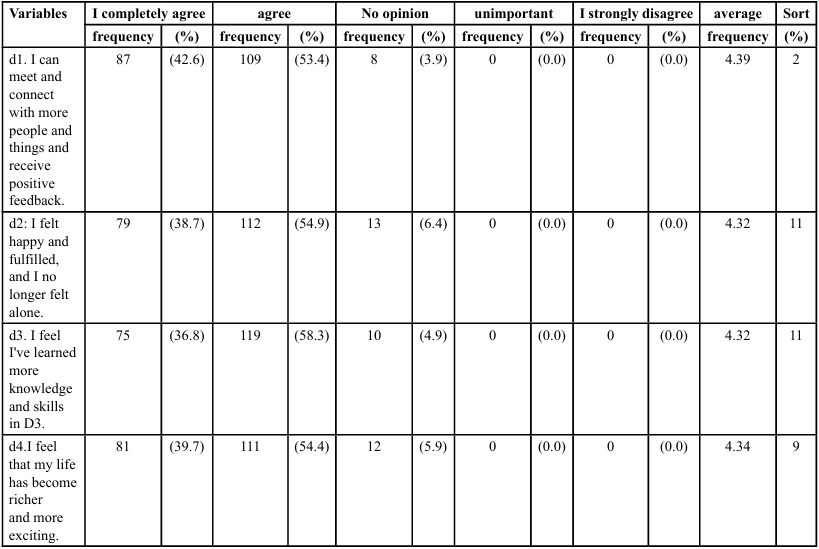 d1 "I can get to know and come into contact with more people and things and receive positive feedback": mean 4.39, indicating that most participants believe time banks broaden their horizons and bring positive feedback.