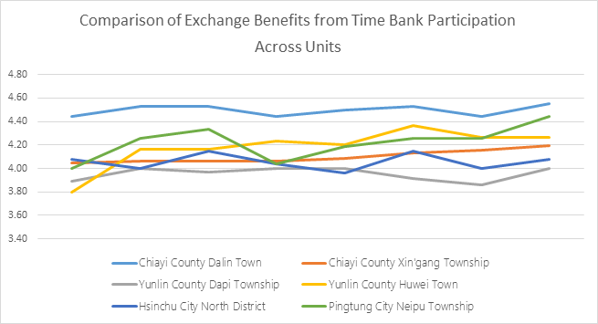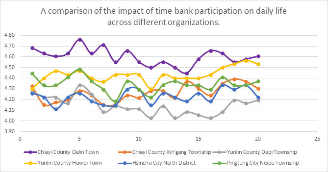 Figure 4 indicates that all sites have mean scores between 4.0 and 5.0, again confirming the positive life impacts of time bank participation. Dalin's "Living Hands Café" consistently shows scores closest to 5.0, suggesting stronger perceived impacts on daily life. Dapi's "Wanpi Family," although still above 4.0, shows relatively weaker effects. Overall, time bank participation enhances quality of life, happiness, and social recognition across communities.