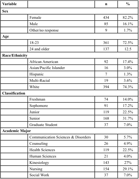 As indicated in Table 1, the sample was primarily female (82.2%); over 70% were 18-23 years old, the age range of traditional college students; and most (61.1%) were upperclassmen and graduate students. Slightly over 74% reported their race/ethnicity as White, followed by African American (17.2%).