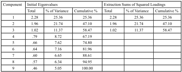 The analysis yielded a three-component solution, accounting for 58.47% of the total variance. The eigenvalues for the three retained components were 2.28, 1.96, and 1.02, respectively. Inspection of the scree plot supported the retention of three components, with a clear leveling of eigenvalues after the third component.